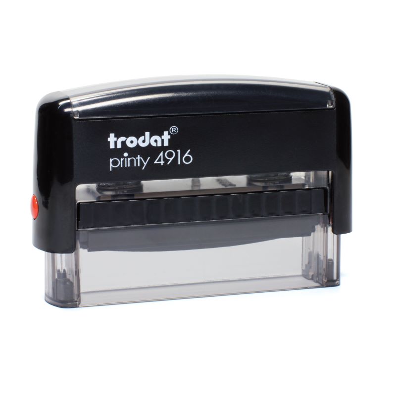The Trodat Printy 4916 is a compact, self-inking rubber stamp designed for personal and professional use. Ideal for a combination of text and logos. This makes it ideal for applications such bank accounts, business names, or short messages. It offers clear and consistent impressions. The stamp is refillable, providing thousands of impressions before needing a replacement ink pad.