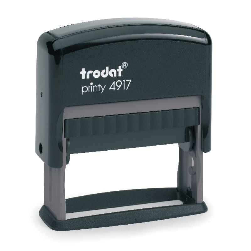The Trodat Printy 4917 is a compact, self-inking rubber stamp designed for personal and professional use. Ideal for applications such as company names, website URLs, or endorsement stamps. It offers clear and consistent impressions. The stamp is refillable, providing thousands of impressions before needing a replacement ink pad.
