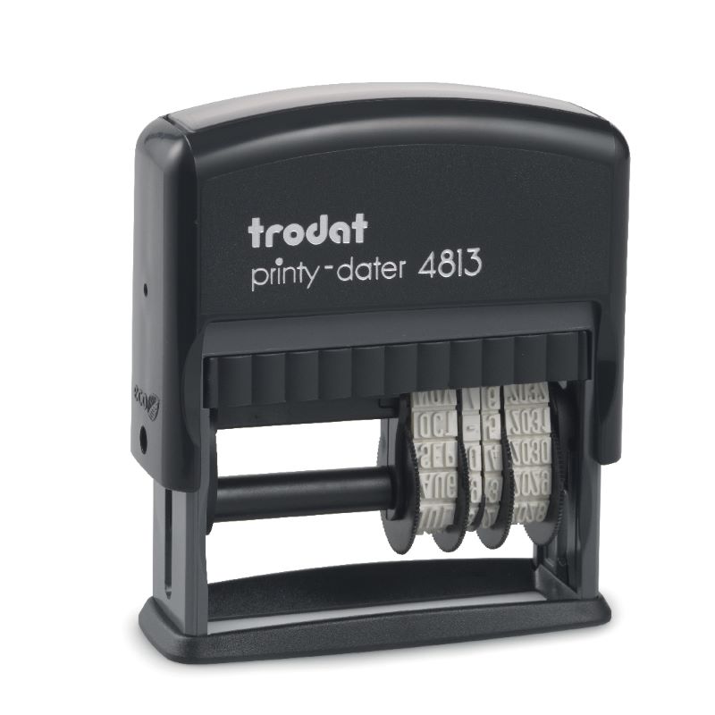 The Trodat 4813 Dater is a Self-inking date stamp. It features a rectangular impression size approximately (9 x 26 mm) and allows for up to one line of custom text to the left of the date. It has a durable plastic frame and prints dates in a day/month/year format. The date bands are easy to rotate by hand, and it uses a built-in ink pad that’s replaceable and mess-free. It’s ideal for stamping documents with the current date efficiently and clearly.