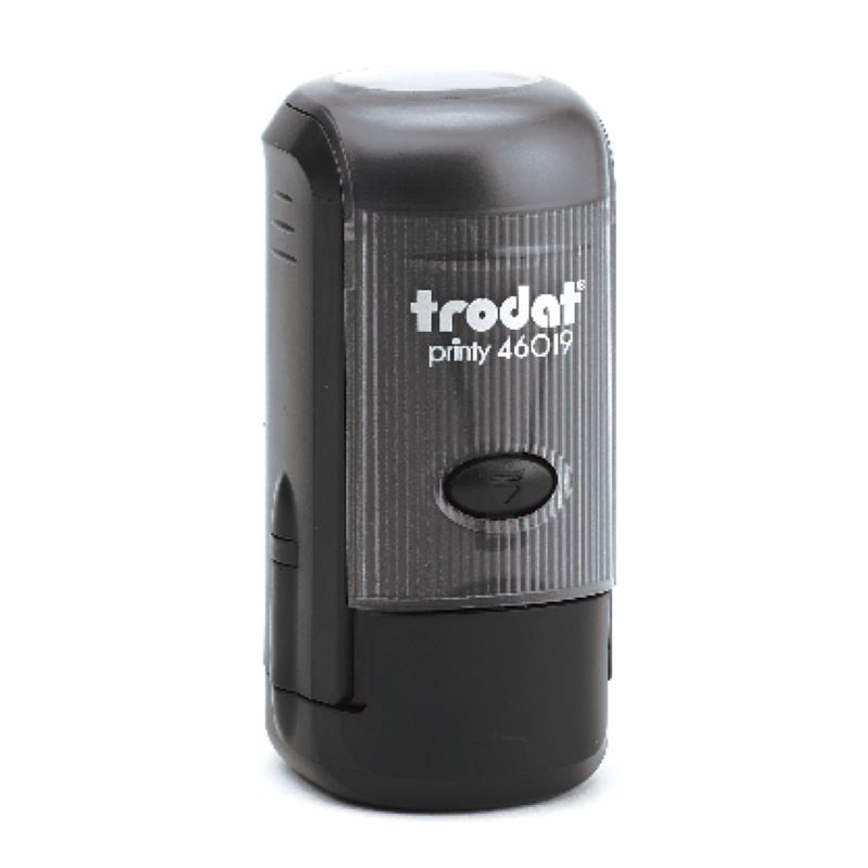 The Trodat Printy 46019 is a Self-inking stamp for high-volume use. Ideal for simple custom logos and round seals. It offers clear and consistent impressions. The stamp is refillable, providing thousands of impressions before needing a replacement ink pad.